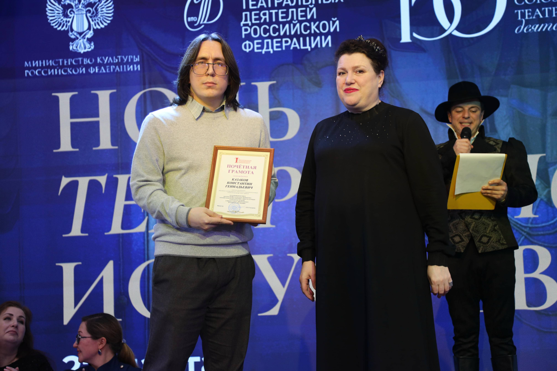 Важной частью мероприятия стало вручение ведомственных наград: Министр искусства и культурной политики Ульяновской области Евгения Евгеньевна Сидорова торжественно вручила Почетные грамоты Министерства искусства и культурной политики Ульяновской области за благотворный и плодотворный труд, высокое профессиональное мастерство, значительный вклад в развитие отрасли культуры в Ульяновской области, а также в связи с празднованием Всемирного дня театра следующим сотрудникам – столяру по изготовлению декораций Андрею Александровичу Ганину, садовнику Денису Александровичу Дементьеву, кассиру билетного отдела Ольге Григорьевне Катковой, инженеру по безопасности дорожного движения Сергею Васильевичу Лепетинскому, реквизитору Екатерине Александровне Мархининой и инженеру-программисту Константину Геннадьевичу Казакову.