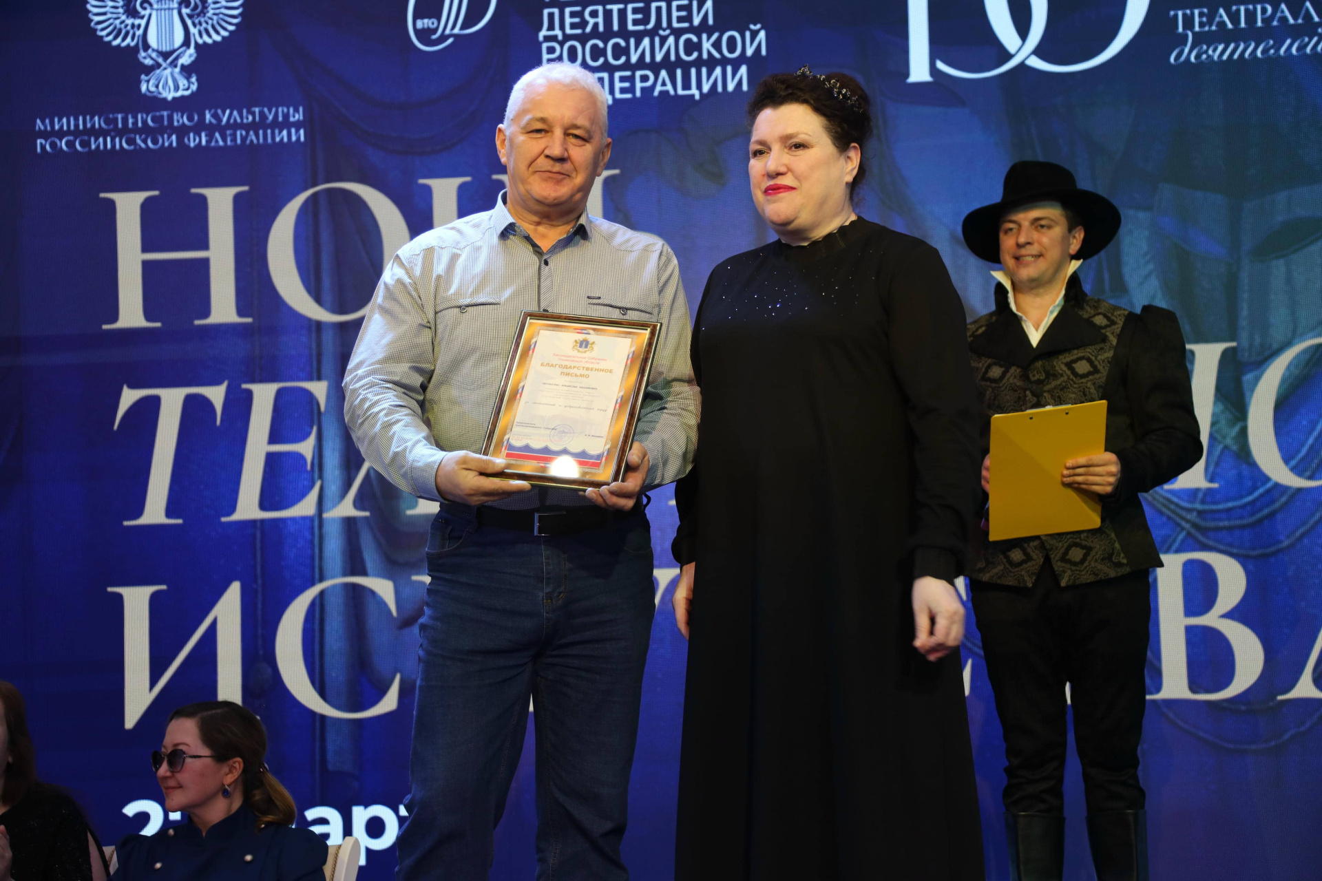 Важной частью мероприятия стало вручение ведомственных наград: Министр искусства и культурной политики Ульяновской области Евгения Евгеньевна Сидорова торжественно вручила Почетные грамоты Министерства искусства и культурной политики Ульяновской области за благотворный и плодотворный труд, высокое профессиональное мастерство, значительный вклад в развитие отрасли культуры в Ульяновской области, а также в связи с празднованием Всемирного дня театра следующим сотрудникам – столяру по изготовлению декораций Андрею Александровичу Ганину, садовнику Денису Александровичу Дементьеву, кассиру билетного отдела Ольге Григорьевне Катковой, инженеру по безопасности дорожного движения Сергею Васильевичу Лепетинскому, реквизитору Екатерине Александровне Мархининой и инженеру-программисту Константину Геннадьевичу Казакову.
